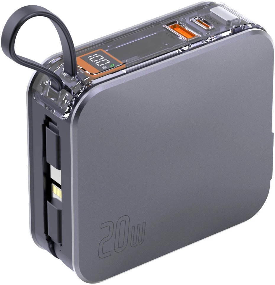 Mit vier Ladeanschlüssen bietet dieses Gerät maximale Flexibilität. Ob Smartphone, Tablet, Kopfhörer oder Smartwatch – alles lässt sich problemlos aufladen. Die integrierten USB-C- und Lightning-Kabel ersparen dir das Mitführen zusätzlicher Kabel, während die beiden USB-Anschlüsse (USB-C und USB-A) dafür sorgen, dass du alle Geräte gleichzeitig laden kannst. Keine Wartezeiten mehr und kein lästiges Suchen nach einem freien Port!